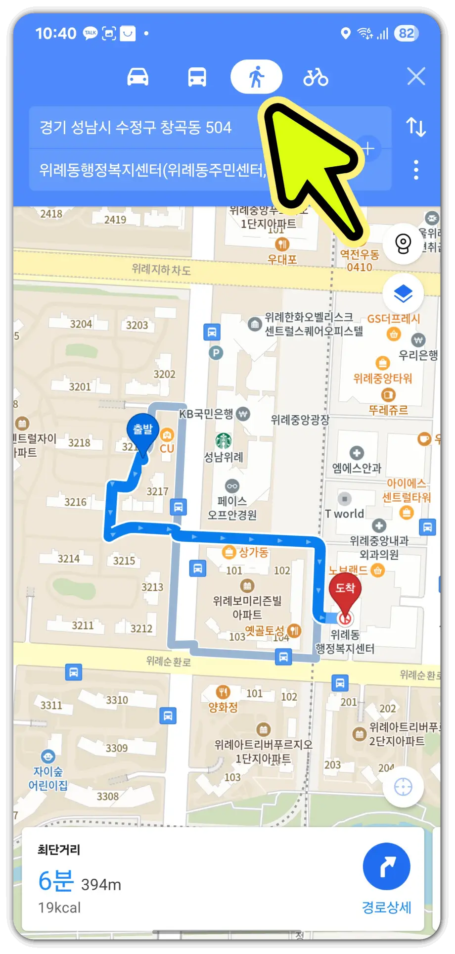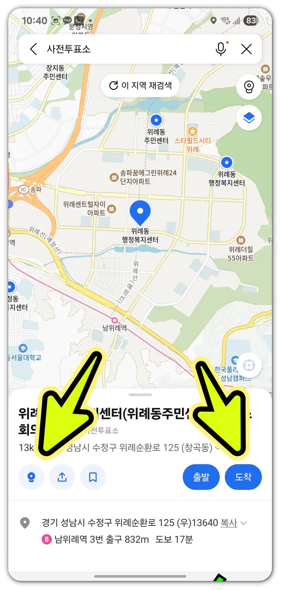 또한, [도착] 버튼을 선택하여 해당 투표소를 목적지로 설정하시면, 내비게이션 기능을 통해 길 안내를 받으실 수도 있습니다. 이 기능은 대중교통(버스, 지하철), 자가용은 물론 도보 경로까지 상세하게 안내해 드립니다.